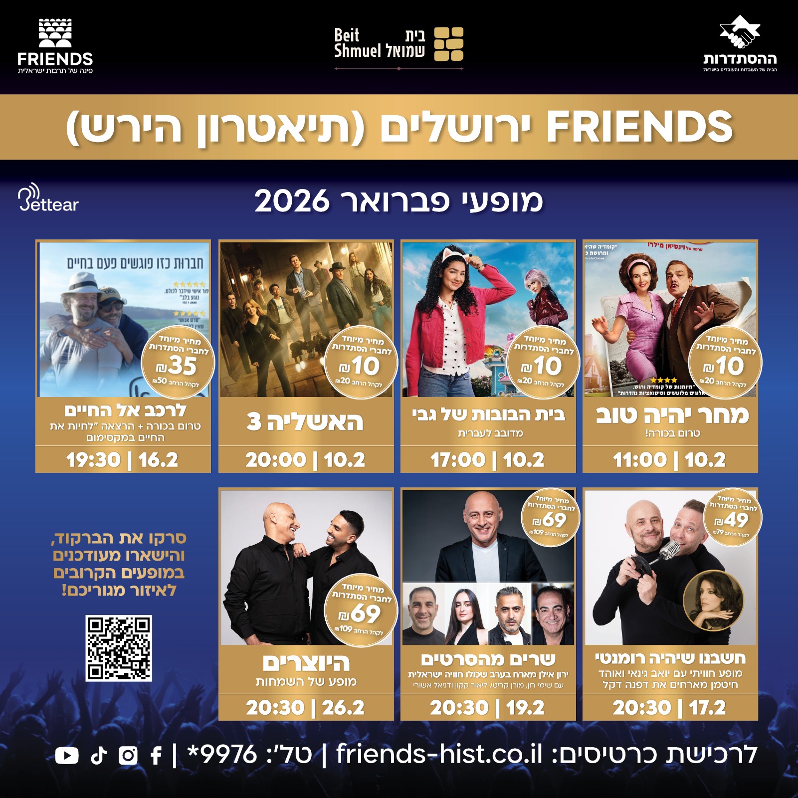 אולם FRIENDS ירושלים (תיאטרון הירש) מבית ההסתדרות מזמין אתכם למגוון אירועי תרבות איכותיים על במה אינטימית ומיוחדת.