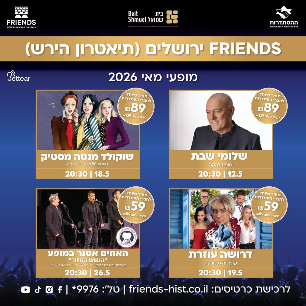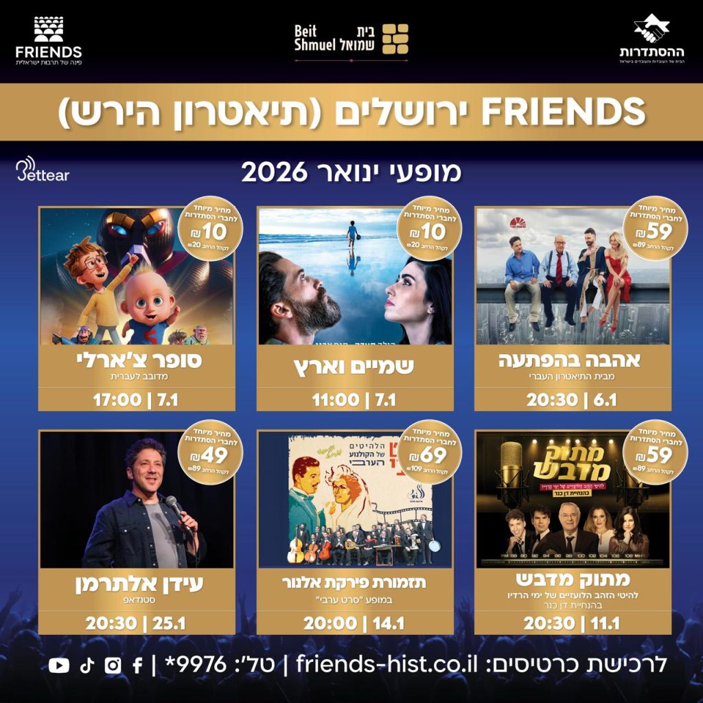 אולם FRIENDS ירושלים (תיאטרון הירש) מבית ההסתדרות מזמין אתכם למגוון אירועי תרבות איכותיים על במה אינטימית ומיוחדת.